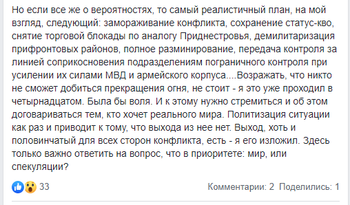 «Если предположить, что присоединение к России наших частей Донбасса будет только первым этапом — тогда да, это наилучший вариант, но так не будет. По крайней мере в ближайшей перспективе. Впрочем, понятие „идеальный“ носит абстрактный характер, и речь в этом случае о вероятностях не идет. Если все же о вероятностях, то самый реалистичный план, на мой взгляд, следующий: замораживание конфликта, сохранение статус-кво, снятие торговой блокады по аналогу Приднестровья, демилитаризация прифронтовых районов, полное разминирование, передача контроля за линией соприкосновения подразделениям пограничного контроля при усилении их силами МВД и армейского корпуса.».
