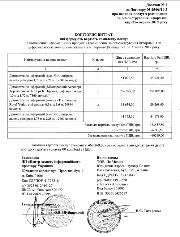 Фирма уже начала получать деньги из госбюджета. В июне "Зе медиа" выиграла тендер на 460 тысяч гривен. Госпредприятие "Центр защиты информационного пространства Украины", подчиненное Мининформполитики, заказало размещение внешней рекламы в канадском городе Торонто с 1 по 7 июля этого года: