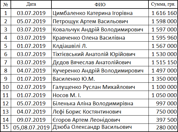Рейтинг граждан - спонсоров партии "Слуга народа". Источник: Страна.ua