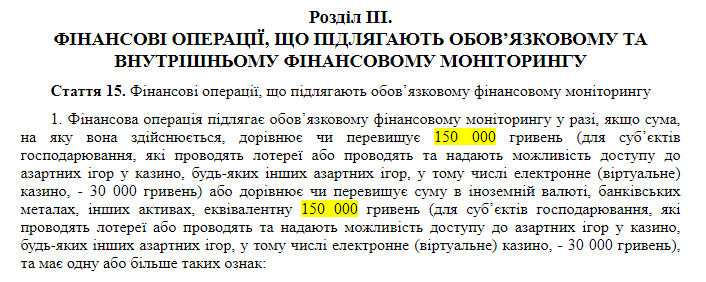 По странному совпадению, платежи больше именно суммы 150 тыс грн. подпадают под финансовый мониторинг. Это установлено статьей 15 Закона "О предотвращении и противодействии легализации (отмыванию) доходов, полученных преступным путем":