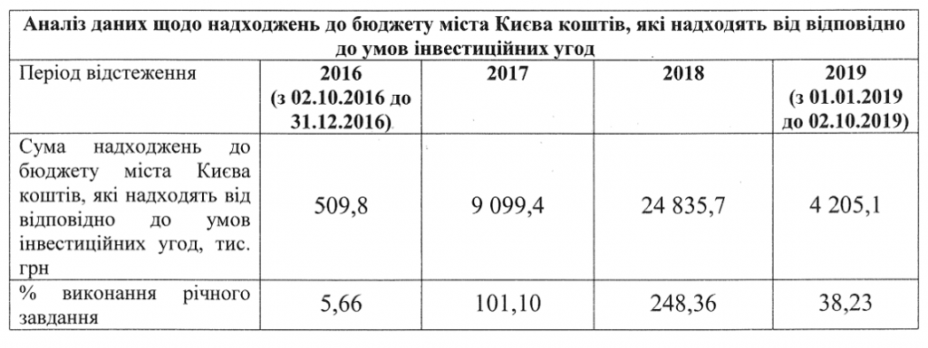 В бюджет Киева от количества заключенных КГГА инвестдоговоров (количество которых в документе, кстати, отсутствует. – KV) за 3 года  поступило всего 38 млн 650 тыс. гривен. По подсчетам Мельник, если в прошлом году данная задача была выполнена аж на 248%, то за 10 месяцев 2019 года – выполнение годового задания составило всего 38,23%.