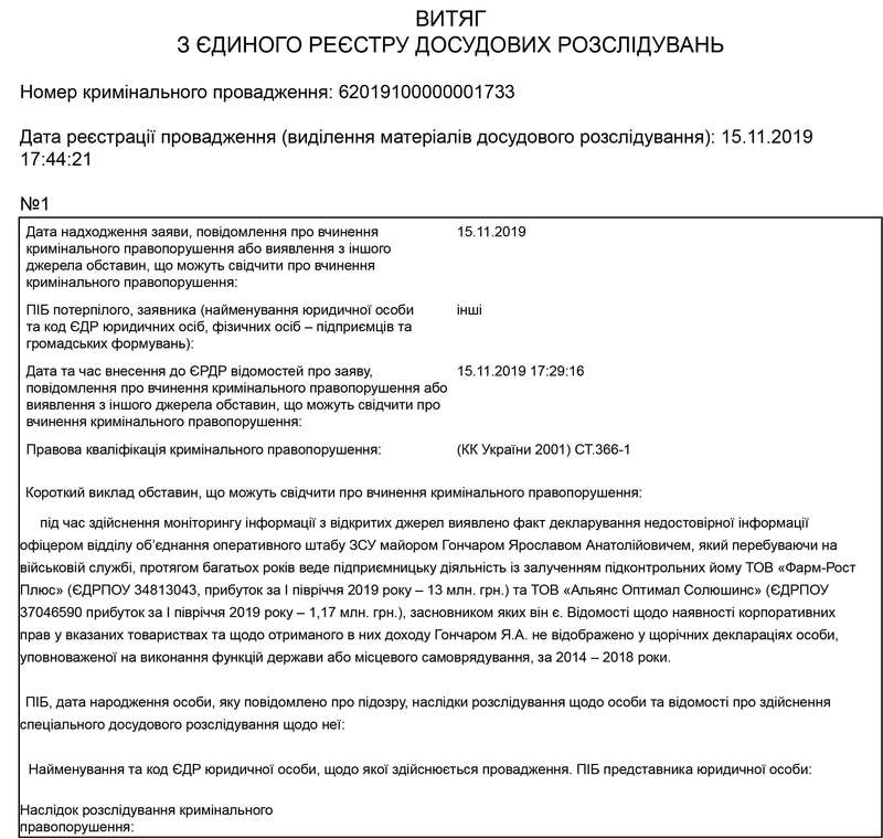 Служащие умудрились создать весьма устойчивую преступную группировку по воровству средств из госбюджета и фондов содействия обороне, направленных на финансирование различного рода оборонных проектов. В частности, Гончар, находясь на военной службе, активно ведет коммерческую деятельность с подключением ряда подконтрольных ему структур. В их числе ООО «Фарм-Рост Плюс» (34813043, от 16.01.2007 г.), ООО «Альянс Оптимал Солюшинс» (37046590, от 14.04.2010 г.) и общественная организация «Всеукраинский благотворительный фонд «Рубеж» (39514011). По состоянию на начало 2019 года на «Фарм-Рост Плюс» перекинули 13 млн. гривен, а на «Альянс Оптимал Солюшинс» — более 1 млн.