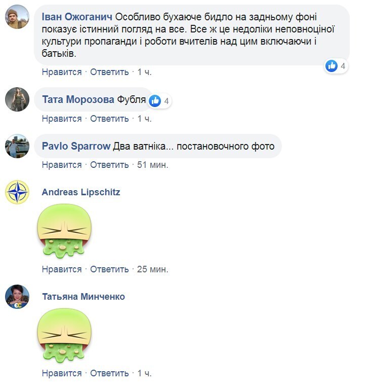 В комментариях под постом, пользователи соцсети оставили возмутительные комментарии: "Особенно бухое б*дло на заднем фоне показывает истинный взгляд на все. Все же это недостатки неполноценной культуры пропаганды и работы учителей над этим включая и родителей", "Фуб*я", "Два ватника ... постановочного фото".