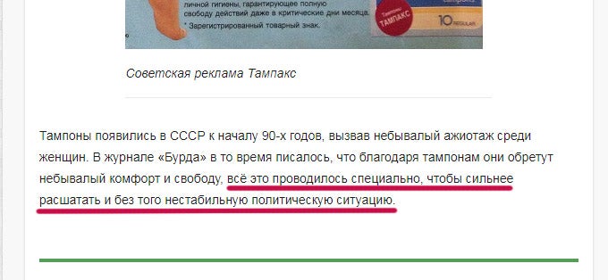 Понятно, отчего так происходит, если начать рассказывать о других аспектах советской жизни — о быте, о медицине, о квартирах, о магазинах — словом, обо всём том, что касается жизни всех людей — то окажется, что СССР был бедной, нищей и отсталой страной, уровень жизни которой был где-то на уровне стран Африки, и в сегодняшнем посте я вам ещё раз это докажу на примере средств женской гигиены.