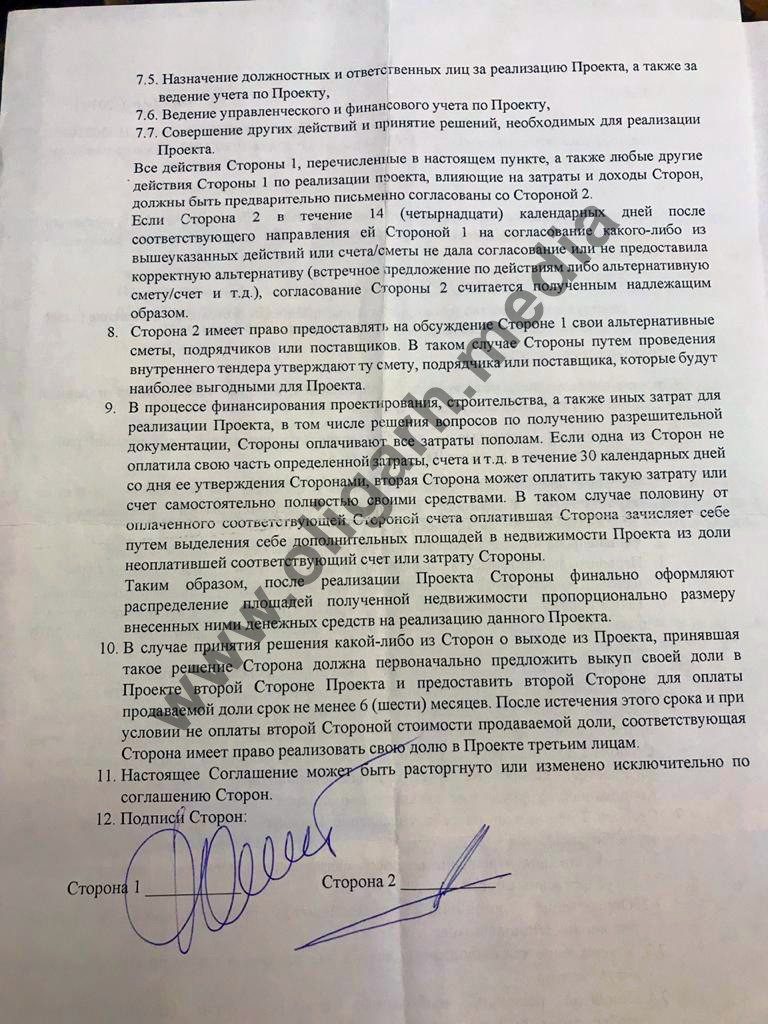 «Сторона 2 обязана оформлять свои права в рамках проекта на лицо (юридическое и физическое), которое не будет являться связанным (аффилированным) лицом с корпорацией «Укрбуд» и ее должностными лицами» – гласит отдельный пункт соглашения. По условиям которого, стороны договорились поровну финансировать все расходы по проекту и делить прибыль от него, при этом управление проектом возьмет на себя Федотенков.
