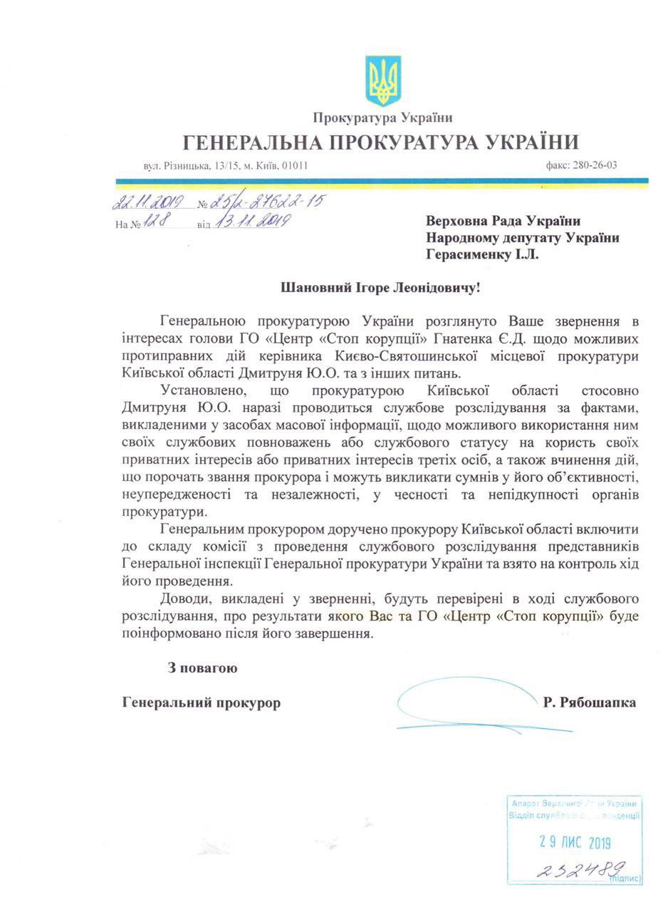 “Установлено, що прокуратурою Київської області стосовно Дмитруня Ю. О. наразі проводиться службове розслідування за фактами, викладеними у засобах масової інформації щодо можливого використання ним своїх службових повноважень або службового статусу на користь своїх приватних інтересів або приватних інтересів третіх осіб, а також вчинення дій, що порочать звання прокурора і можуть викликати сумнів у його обєктивності, неупередженості та незалежності, у чесності та непідкупності органів прокуратури. Генеральним прокурором доручено прокурору Київської області включити до складу комісії з проведення службового розслідування представників Генеральної інспекції Генеральної прокуратури України та взято на контроль хід його проведення”, - йдеться у листі Генпрокурора Руслана Рябошапки до нардепа Ігоря Герасименка.