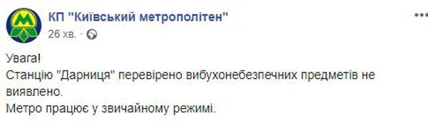 «Станция „Дарница“ закрыта для пассажиров. Поступил анонимный звонок о минировании. Проводится проверка»,— сказано в сообщении.