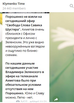 По нашим данным сегодняшнее участие Владимира Зеленского в эфире на телеканале Ахметова было при обязательном условии отсутствия на нем Порошенко. Юлю и Славу можно, Петю — нет», — говорится в сообщении.