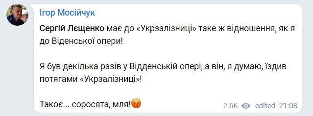 "Сергей Лещенко имеет к "Укрзализныце" такое же отношение, как я к Венской опере. Я несколько раз был в Венской опере, а он, я думаю, ездил поездами "УЗ", - написал в своем Telegram-канале Игорь Мосийчук.