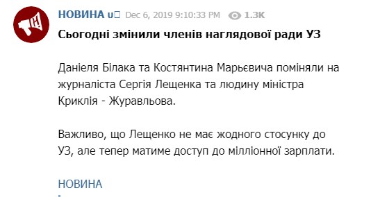 "Сегодня поменяли членов наблюдательно совета "УЗ" Даниэля Билака и Константина Марьевича на одиозного журналиста Сергея Лещенко, который к УЗ не имеет никакого отношения, и человека министра (инфраструктуры, Владислава, - прим.ред.) Криклия – на некого Журавлева", - написал он.
