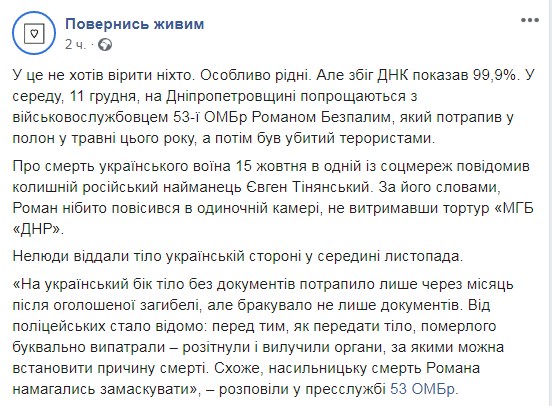 В среду, 11 декабря, под Днепром попрощаются с украинским военнослужащим Романом Беспалым, который попал в плен боевиков вблизи Новотроицкого и был замучен боевиками. Его тело вернули, но…без внутренних органов.