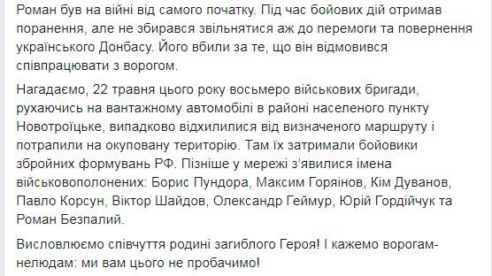 Роман был на войне с самого начала. Во время боевых действий получил ранения, но это не помешало ему не уволиться и продолжать службу. В тот день, 22 мая, в плен боевиков вместе с Романом попали еще семеро украинских военнослужащих. Они, передвигаясь на грузовом авто, случайно отклонились от определенного маршрута и попали на оккупированную территорию.