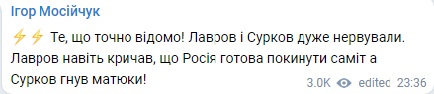 «То, что точно известно! Лавров и Сурков очень нервничали. Лавров даже кричал, что Россия готова покинуть саммит, а Сурков гнул мат!», — заявил Мосийчук.