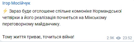 «Сейчас будет объявлено совместное коммюнике Нормандской четверки, а его реализация начнется на Минской переговорной площадке. Поэтому жизнь продолжается, идет война!», — подытожил Мосийчук.
