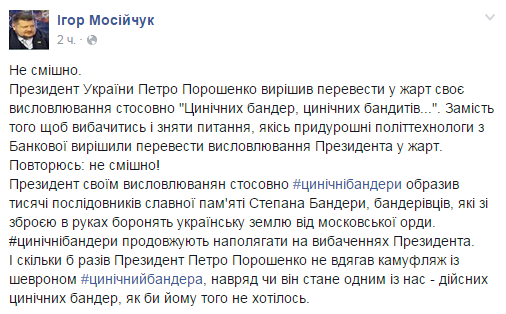 “Не смешно. Президент Украины Петр Порошенко решил перевести в шутку свое высказывание относительно “циничных бандер, циничных бандитов …”.Вместо того чтобы извиниться и снять вопрос, какие придурочные политтехнологи с Банковой решили перевести высказывание Президента в шутку.