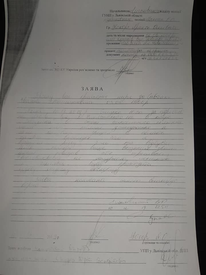 Інцидент стався зранку 10 грудня. За словами дівчини, чоловік був у стані алкогольного сп’яніння. Ярина Кокор також опублікувала фото заяви, яку вона написала у Личаківському відділку поліції.