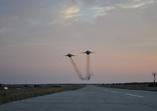 Отмечается, что звенья дежурных самолетов Су-27СМ и Су-30М2 были подняты по тревоге и направлены на перехват военных самолетов условного противника, нарушивших воздушную границу.