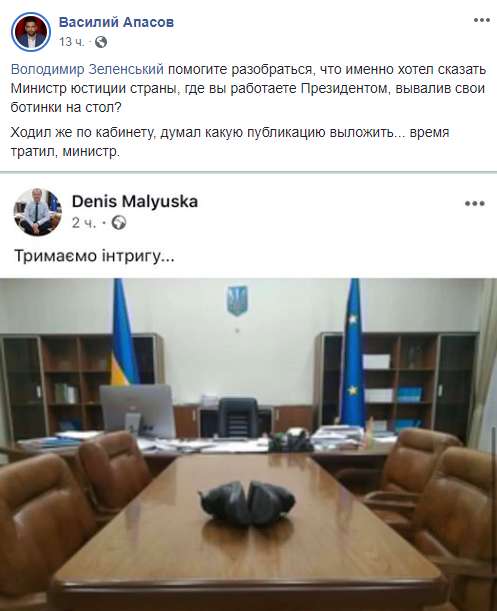На официальной странице министра была опубликована фотография, где на пустом столе стоит пара мужских туфель. Фото подписано фразой “держим интригу”.