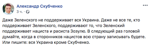 “Даже Зеленского не поддерживает вся Украина. Даже не все те, кто поддерживает Зеленского, поддерживают то, что Зеленский поддерживает нациста и расиста Зозулю. В следующий раз головой думайте, когда в сторонников нацистов всю страну записывать будете. Или пишите: вся Украина кроме Скубченко”, – пишет блогер Александр Скубченко.