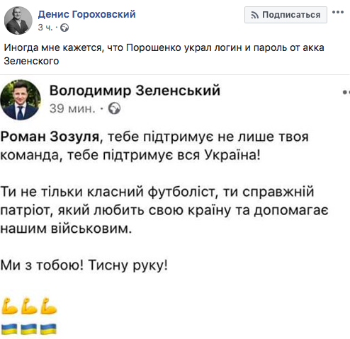 “Роман Зозуля, тебя поддерживает не только твоя команда, тебя поддерживает вся Украина! Ты не только классный футболист, ты настоящий патриот, который любит свою страну и помогает нашим военным. Мы с тобой! Жму руку!”, – написал Зеленский в Facebook.
