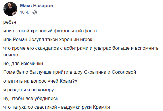 “Роме было бы лучше прийти в шоу Скрыпина и Соколовой и ответить на вопрос “чей Крым?”. И раздеться на камеру – ну, чтобы все убедились, что татуха со свастикой – выдумки руки Кремля”, – пишет журналист Макс Назаров.