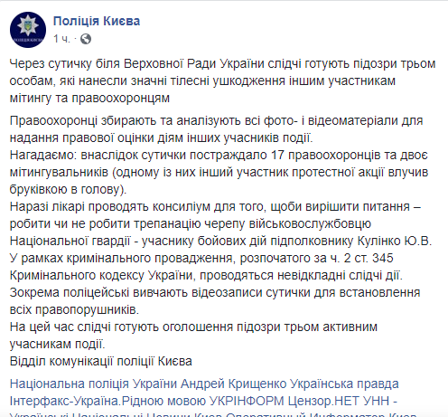 Во время стычек под Верховной Радой в Киеве были нанесены значительные телесные повреждения участникам митинга, а также правоохранителям. Следственные службы уже готовят подозрения трем подозреваемым лицам.