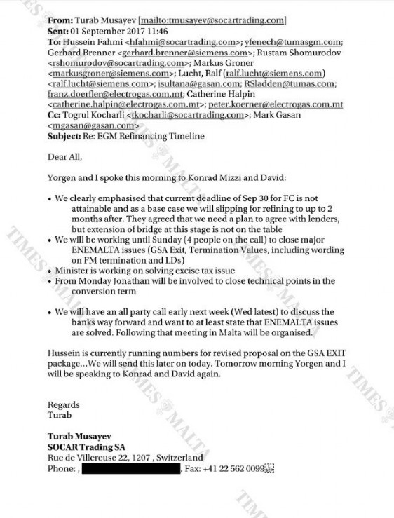 Приводятся документы – вероятно, добытые из электронной почты Мусаева. Судя по этим бумагам, он мог участвовать в махинациях, а не только знал о них, да еще и делал попытки повлиять на работу мальтийской госкорпорации «Enemalta».