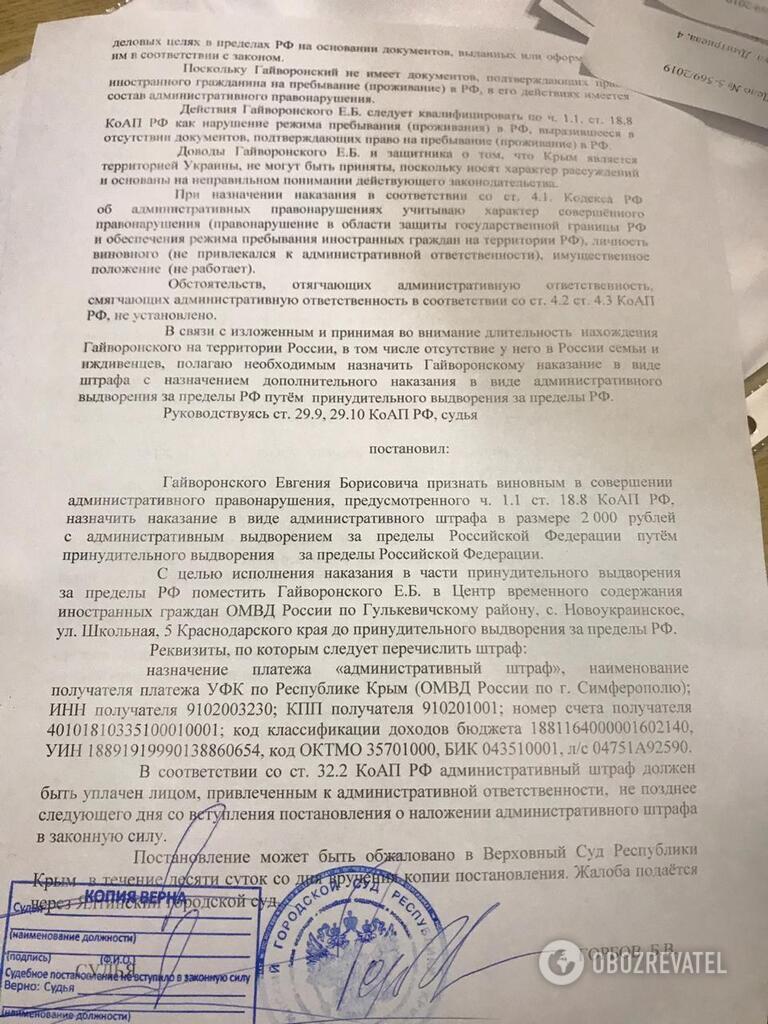 Впоследствии Евгений предоставил копию решения суда о его выдворении из России и взыскании административного штрафа в размере 2000 рублей (порядка 700 грн).