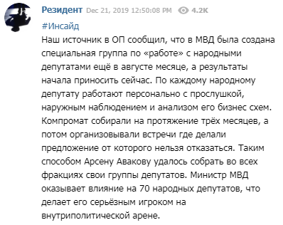 «Наш источник в ОП сообщил, что в МВД была создана специальная группа по «работе» с народными депутатами ещё в августе месяце, а результаты начала приносить сейчас. По каждому народному депутату работают персонально с прослушкой, наружным наблюдением и анализом его бизнес схем», — говорится в публикации.