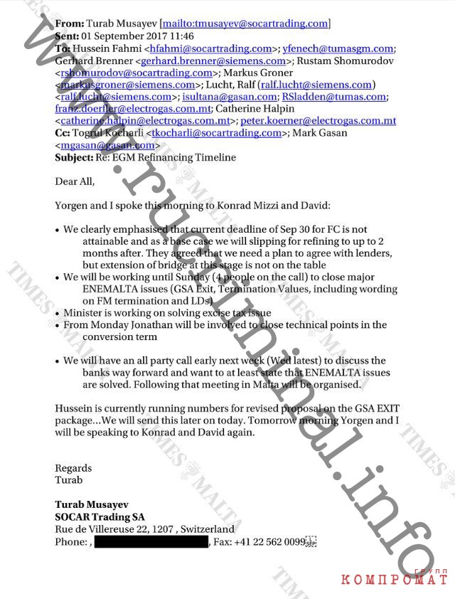 В Європі вже прямо говорять про причетність до комбінацій директора «Electrogas» Тураба Мусаєва. Він не лише забезпечував зв’язок мальтійської та азербайджанської сторін, але й разом з братом Талехом був вигодонабувачем незаконної діяльності на Мальті.