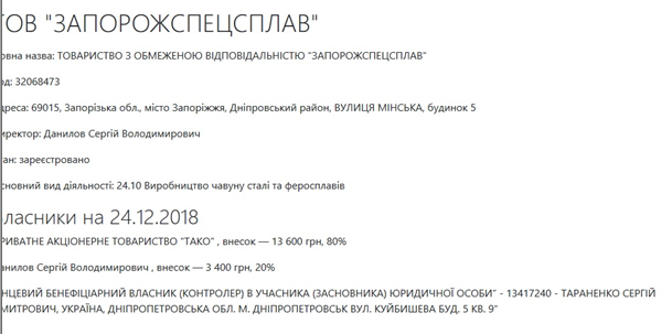 Принадлежность предприятия прослеживается довольно легко: Тараненко Сергей Дмитриевич, указанный как конечный собственник ООО «Запорожспецсплав» , является человеком Краснова, на которого также записаны и другие его активы, помимо ЧАО «ТАКО» — ОАО «Днепропетровский стрелочный завод», ООО «Завод Трансмаш» и ЧАО «Запорожский завод железобетонных шпал».