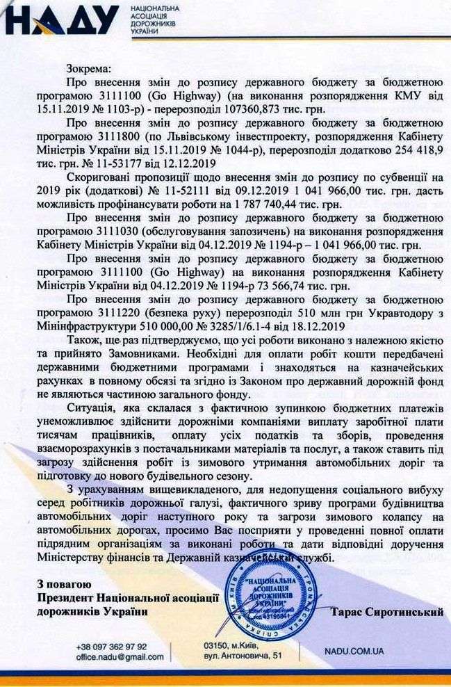 «Для недопущения социального взрыва среди рабочих дорожнойотрасли, фактического срыва программы строительства автомобильных дорог вследующем году и угрозы зимнего коллапса на автомобильных дорогах, просим Васоказать содействие в проведении полной оплаты подрядным организациям завыполненные работы и дать соответствующие поручения Министерству финансов иГосударственной казначейской службе», — сказано в письме НАДУ.