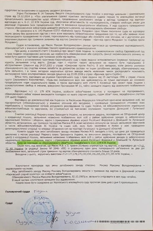 Он опубликовал фотокопию решения Дзержинского районного суда Харькова об изменении меры пресечения Максиму Мисяку. По информации юриста, на этой неделе прокуратура подала ходатайство о смене меры пресечения с содержания под стражей на личное обязательство