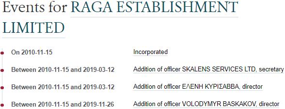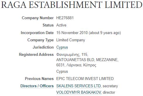 За даними торгового реєстру Республіки Кіпр, директором офшорної компанїї «Raga Establishment Limited», починаючі з 15.11.2010, виступає громадянин України Баскаков Володимир Юрійович.