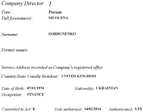 Варто зауважити, що посаду директора даної британської компанії в період з 14.02.2014 і до 04.09.2018 (дати закриття даної компанії) також обіймала дружина Горбуненка Д.В. – Горбуненко Олена Миколаївна 07.01.1974 р.н, прописана в м.Києві за адресою: вул.Антоновича, 3 кв. 6.