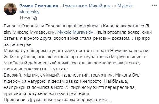 У Тернопільській області пострілом з автомата наклав на себе руки відомий ветеран АТО Микола Муравський, якого знають по позивному “Цибуля”.