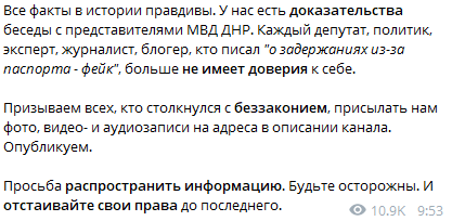 6 января после 20:00 правоохранители "ДНР" задержали для проверки личности одного из администраторов канала, у которого был при себе украинский паспорт.
