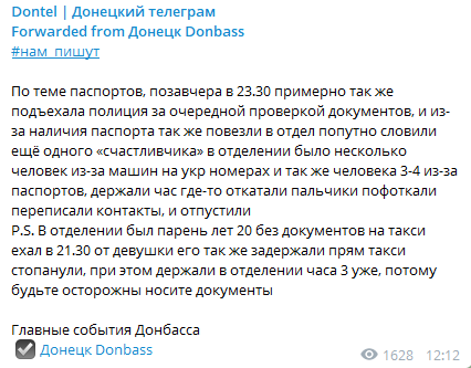 Ведущий канала "Русский ориенталист" Игорь Димитриев, который долгое время жил в Донецке, также пишет о задержании полицией "ДНР" людей в праздники из-за отсутствия "республиканского паспорта" для идентификации - мол, украинский уже не признается документом удостоверяющим личность.