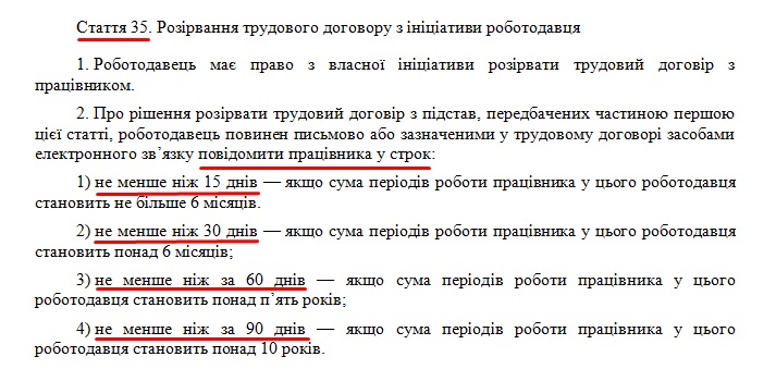 Як бачимо, у ст. 35 законопроєкту про працю вказано строки звільнення та передбачено варіанти, як повідомити найманому працівнику про його звільнення.