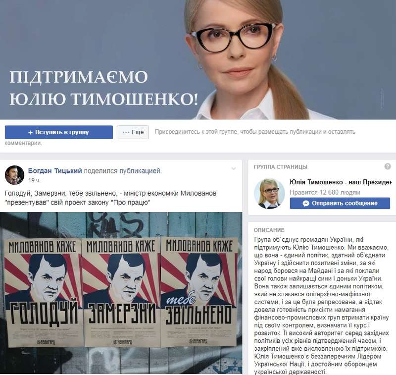 До речі, публікацію про акцію із плакатами Милованова поширили у групі на підтримку Юлії Тимошенко, яка звісно зацікавлена в тому, аби Верхова Рада прийняла саме її проєкт Кодексу України про працю.