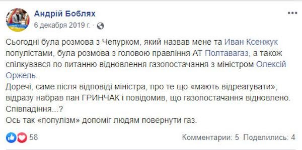 Так, 6 декабря 2019 года Боблях на своей странице в Фейсбук делится «достижением»: сразу после его, Бобляха, телефонного звонка министру энергетики и окружающей среды Алексею Оржелю, с ним связался председатель правления ОАО «Полтавагаз» Ростислав Гринчак и сообщил, что газоснабжение жителям микрорайона Полтавы возобновлено. И резюмирует: