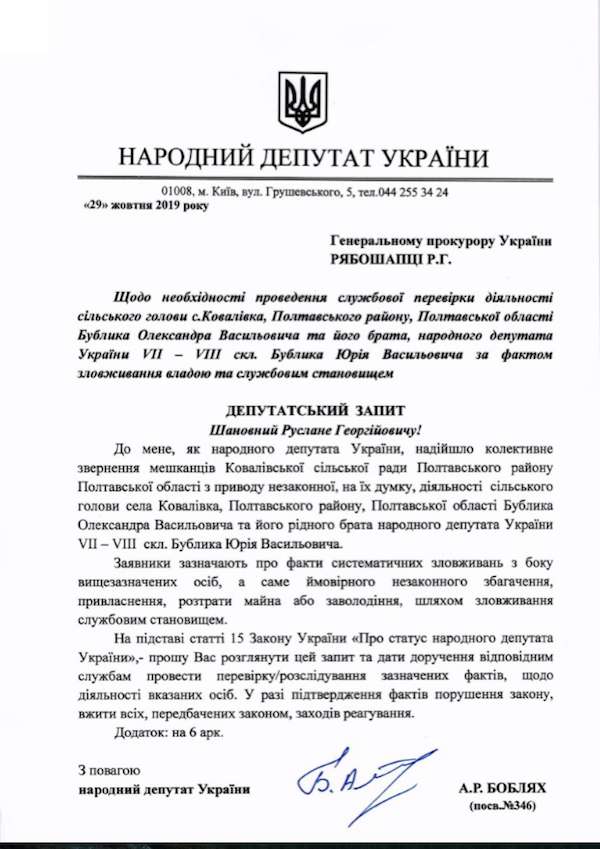 Второй скандал связан со сведением счетов с политическим оппонентом - с конкурентом на выборах в Раду Юрием Бубликом. Который не согласился "сдаться без боя", за что и был оперативно "притравлен" Андреем Бобляхом после победы с помощью Генпрокуратуры. Один из двух депутатских запросов, написанных Бобляхом, выглядит так: