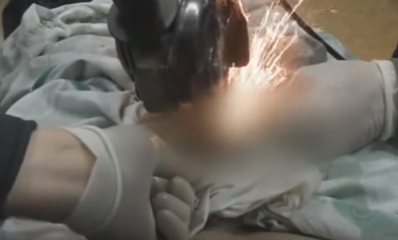 На видео видно, что спасателям пришлось воспользоваться спецоборудованием. Железо пришлось пилить болгаркой, параллельно орошая место операции водой во избежание ожогов.