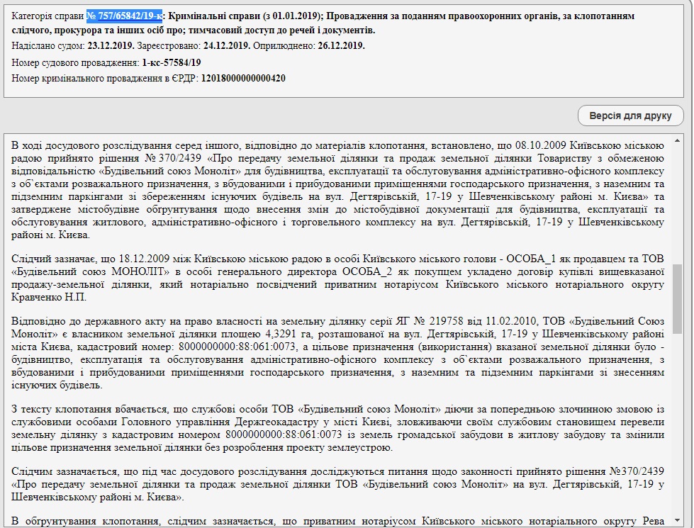 С целью установления важных обстоятельств и лиц, которые фактически причастны к ведению указанного строительства, у Нацполиции возникла необходимость изучить регистрационное дело ООО “Бау-Украина”, находящееся во владении Шевченковской РГА. 18 декабря 2019 года судья Печерского районного суда Киева Ирина Литвинова предоставила следствию доступ к соответствующим документам.
