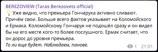 Тарас Березовец в Telegram предположил, что Гончарука "сливают" свои.