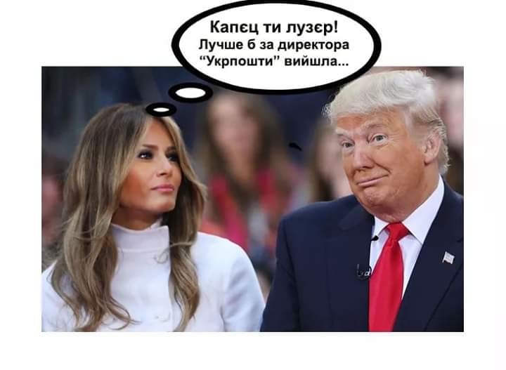 На одной из забавных картинок Дональд Трамп изображен рядом с первой леди, при этом Мелания Трамп рассуждает, что лучше бы вышла замуж за директора Укрпочты, а не за этого "лузера".