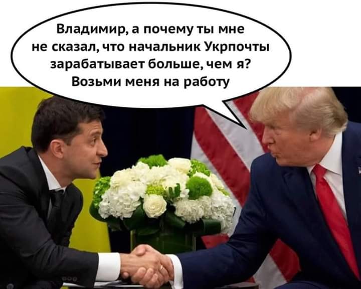 На еще одной картинке президент США, узнав о зарплате начальника "Укрпочты", на встрече с украинским президентом Владимиром Зеленским просится к нему на работу.