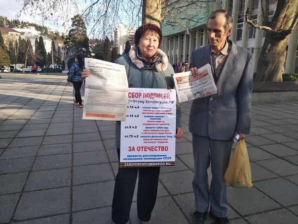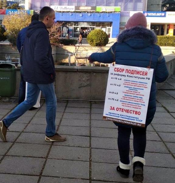 Если присмотреться внимательно, то на информационном плакате, который на себе носят агитаторы, подписи собираются не только за внесение изменений в Конституцию России, но и за расследование «незаконной ликвидации СССР».