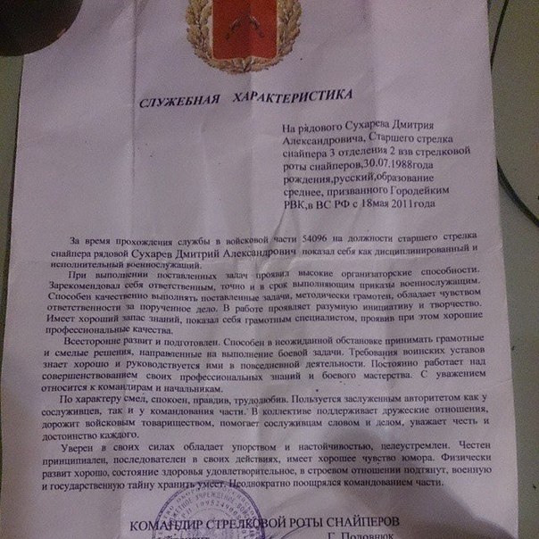 Это же фото можно найти в контакте у российского военного Дмитрия Сухарева из Москвы, служащего в том же подразделении. В своем инстаграмме он зачем-то выложил личную характеристику, сделанную во время прохождения им срочной службы.