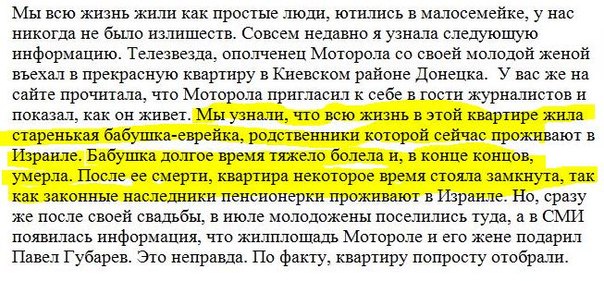 На сайте Dialog.ua опубликовано «письмо ополченки», из которого следует, что Сеня поселился в пустующую квартиру, в то время, как её хозяева находятся в Израиле.